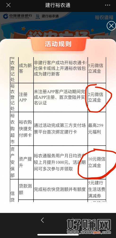 只要注册过建行裕农通的用户,建行余额较上月提升1000元,就可以领1次10元微信立减金,能领2个10元的是2个月份达标