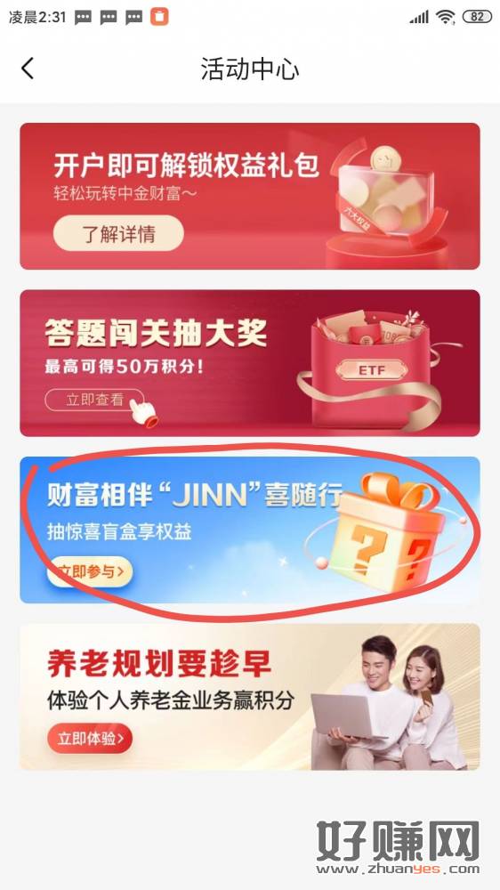 中金财富app,我的,活动中心 财富 大盲盒 刚中50