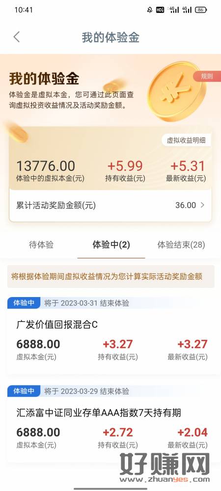 工商银行,搜索我的体验金,我已经累积收益36元了,单笔最高收
