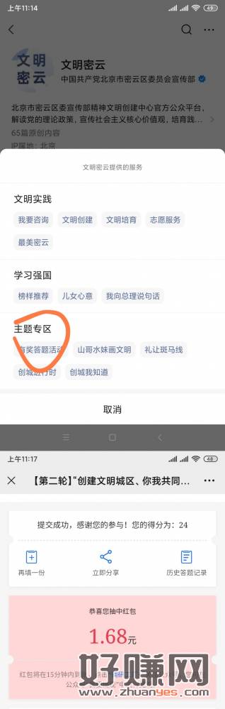 威信搜 文明密云 公众号 不用关注 点服务 有奖答题活动 进去答题 拿到按提示关注公众号 手动提