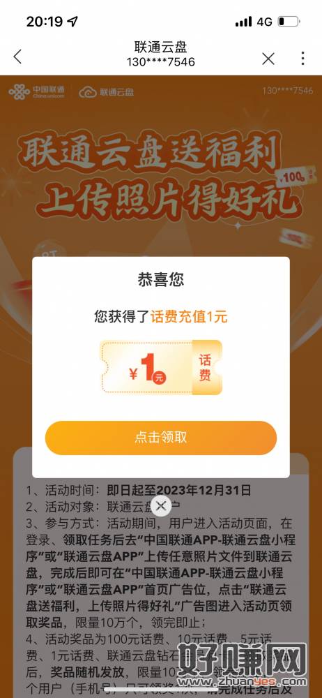 中国联通APP-搜索联通云盘-进入小程序随便上传一张图片抽,话费直充的,有做过的无视