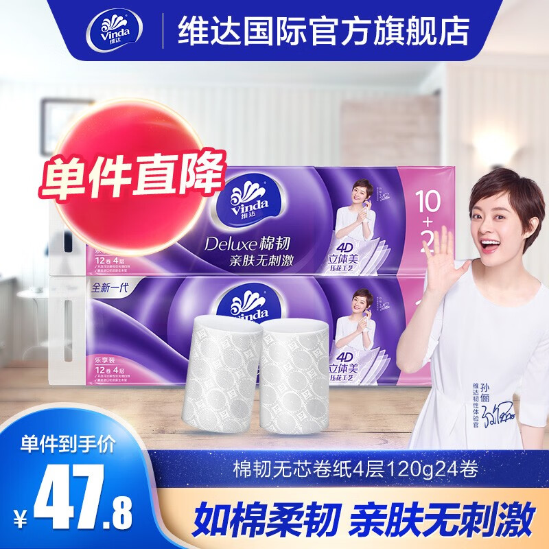维达(Vinda)棉韧立体美无芯卷纸4层120g24卷