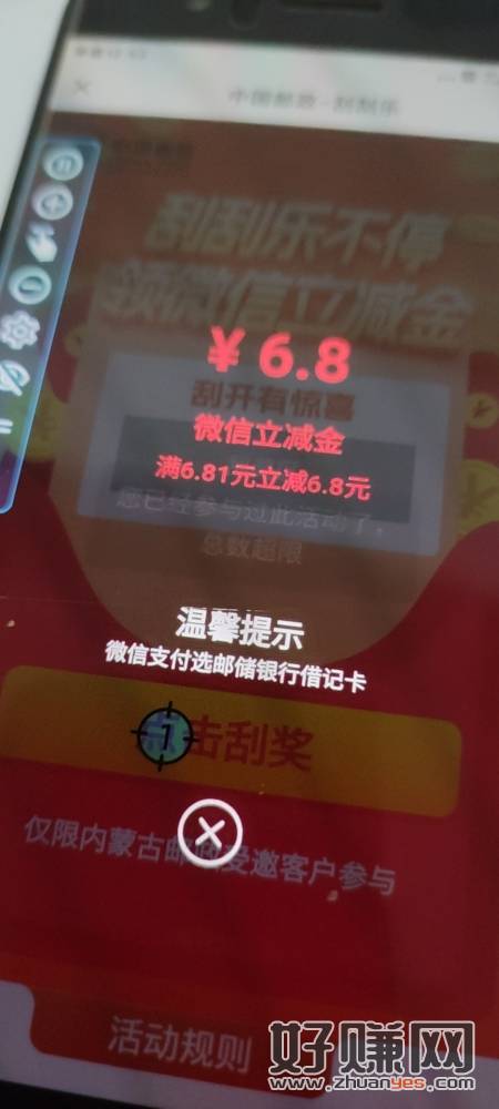 邮储保底6.8立减金不限卡,多v多撸,微信扫,挂连点器一直点