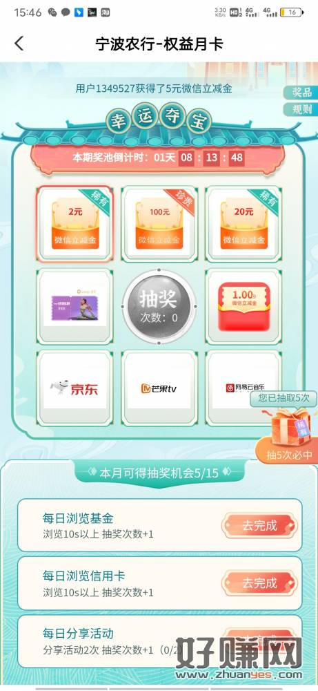 飞浙江宁波,城市转去下滑有个权益服务点进去,然后点那个权益月卡里面可以抽奖,保底有2,