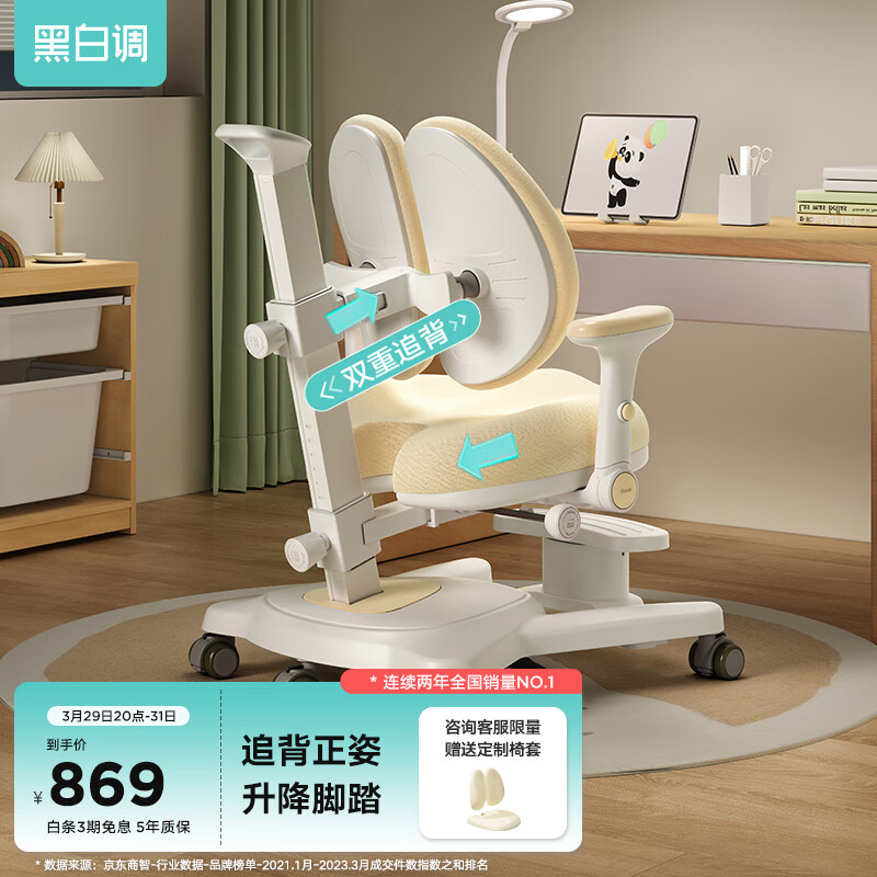 黑白调 学习时光儿童学习椅G6,追背正姿 可拆卸脚踏 升降可旋转扶手