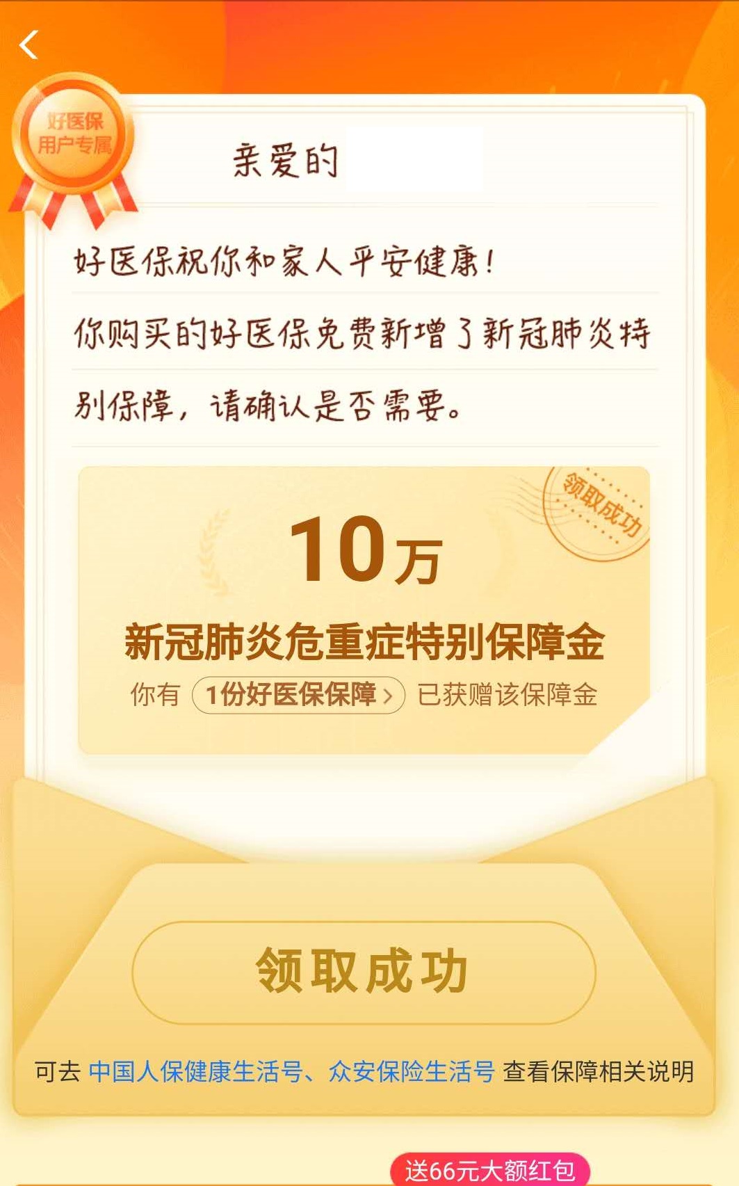 买了好医保的, 免费领1年 新冠 赔10万