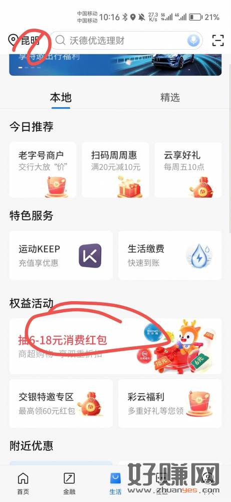 交行app生活左上角定位昆明,拉倒下面去抽奖,抽奖后去买京东