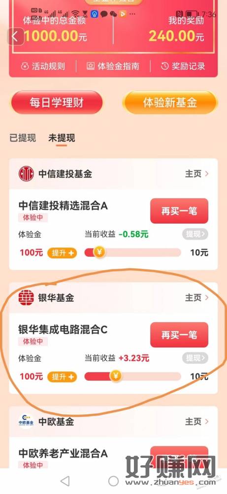 天天基金一个基金体验可以提现了