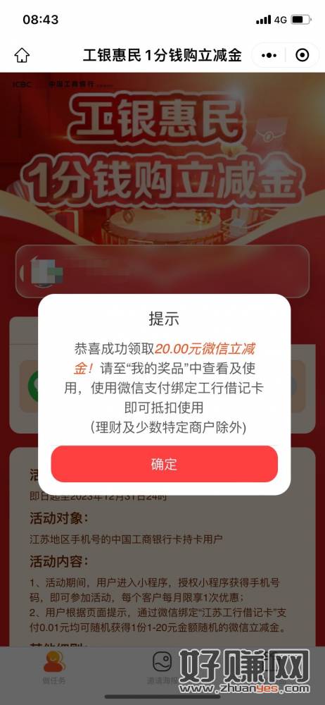 江苏工行储蓄卡,微信扫二维码1分钱领立减金,实测20