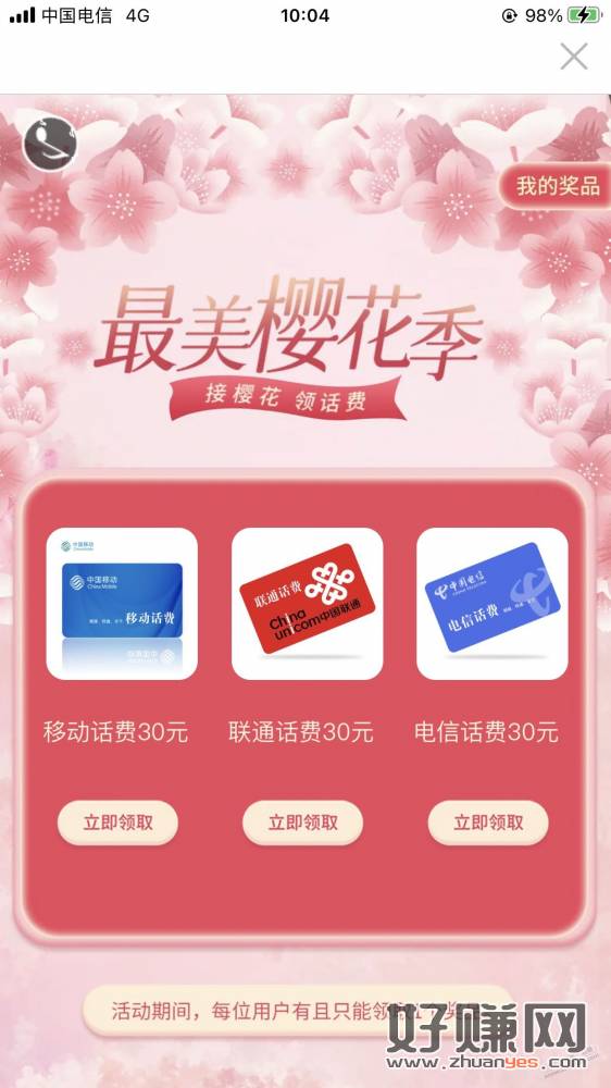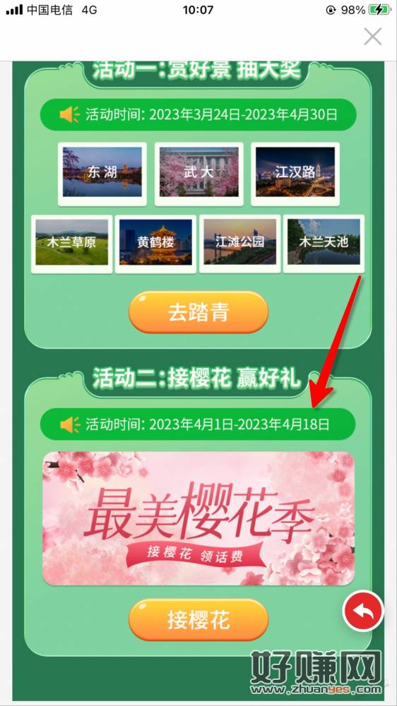 10点,武汉农商银行,接樱花游戏每天3次,只能中奖1次,30元话费,4月30日截止,接50朵,很好完成