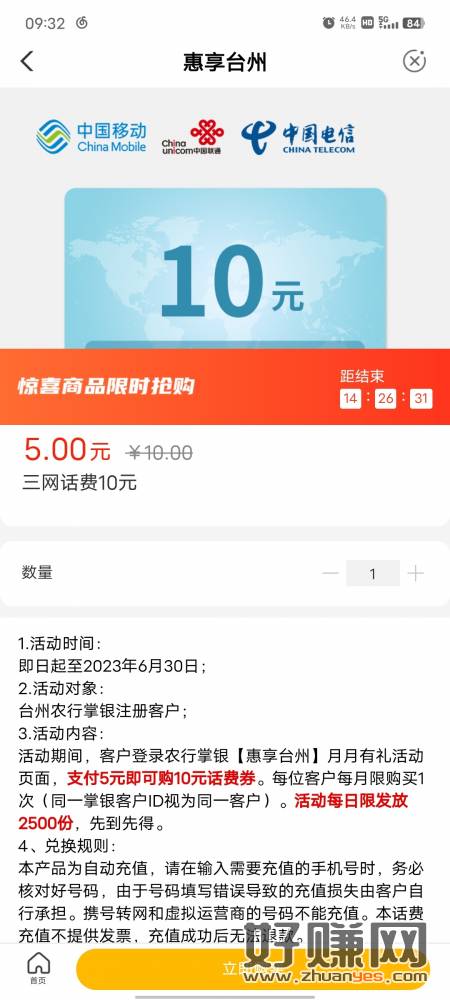台州城市专区月月有礼5充10话费还有
