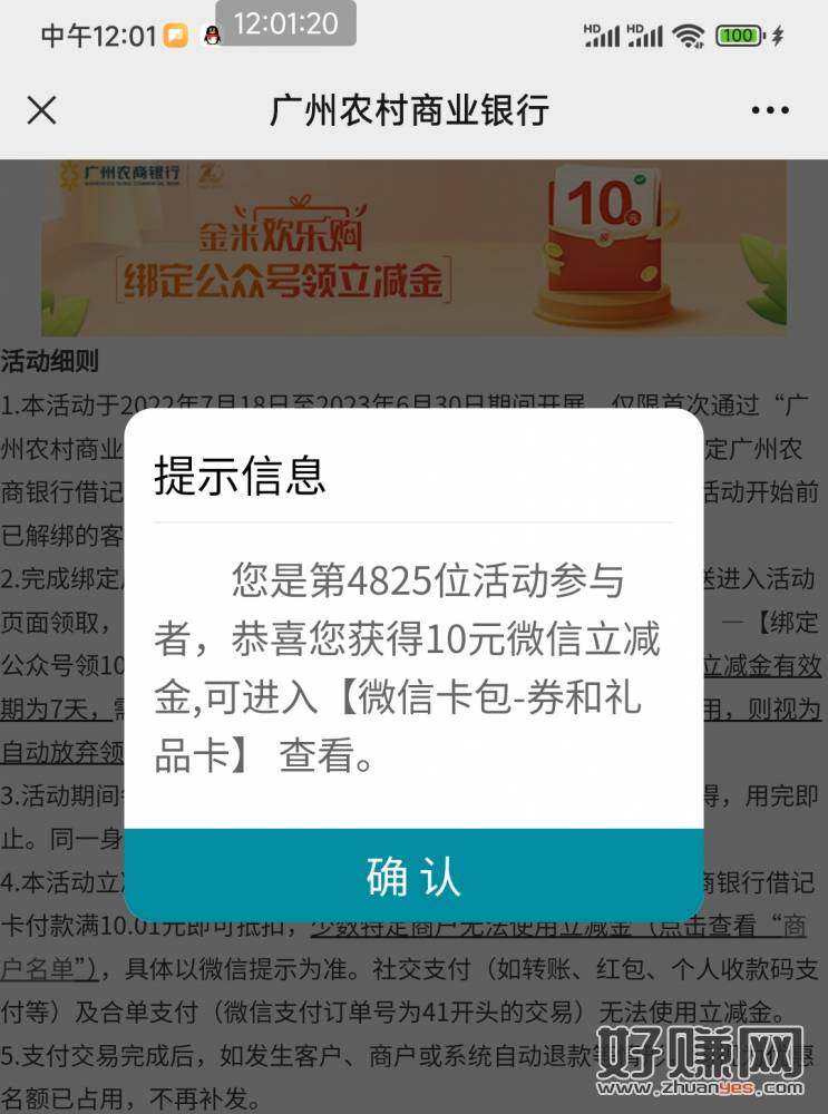 “广州农村商业银行”公众号,金米福利——公众号绑卡领10元微