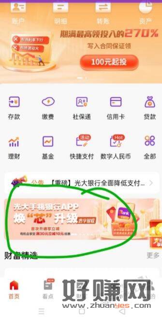 光大银行app升级到最新版本,进入点首页滚动的横幅,找到图上这个点进去先授权升级