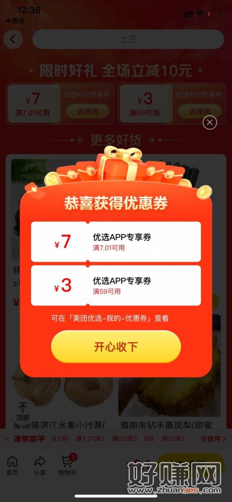 美团优选APP 主页横幅10点进去领取7 下单后退出再进去领