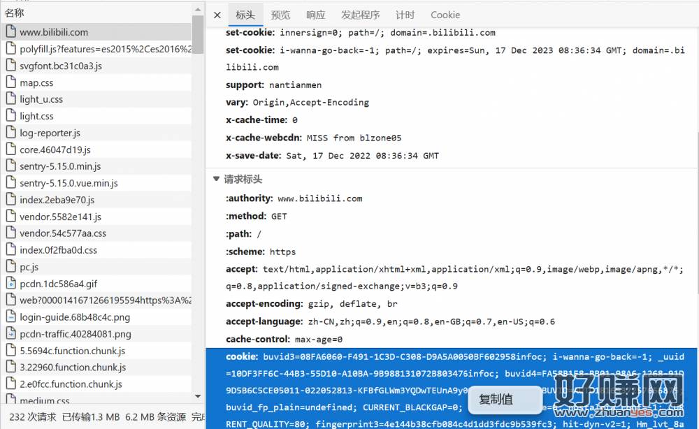 http://www.bilibili.com网络请求,在标头=>请求标头中找到cookie