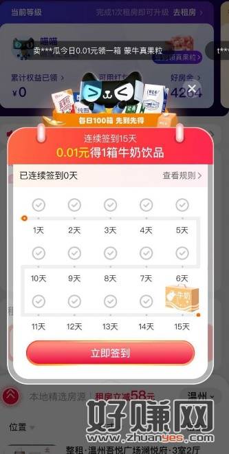 支付宝搜索“天猫好房”->喵屋汇->连续签到15天0.01元领一箱牛奶包邮!