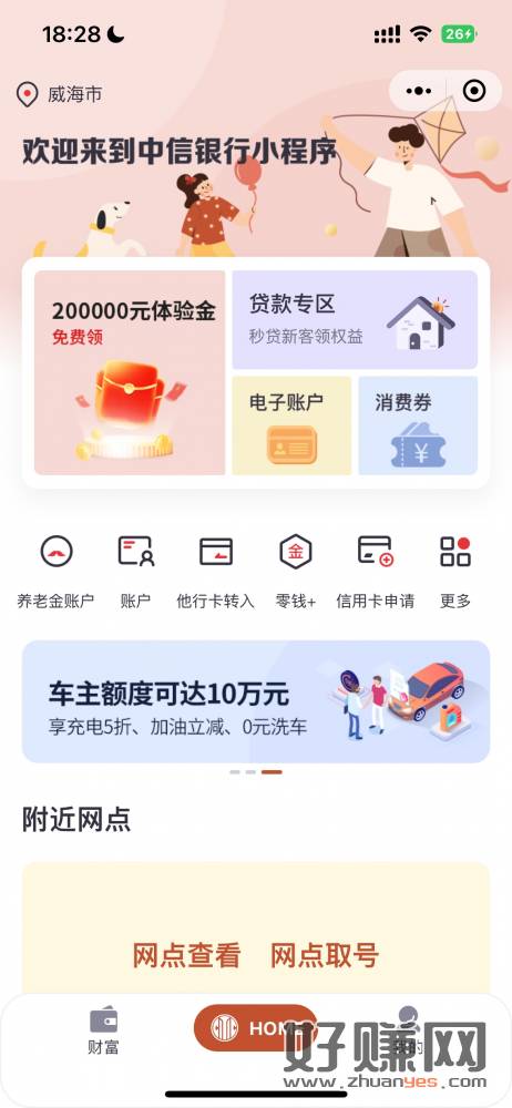 微信搜索中信银行小程序 ,点击200000元体验金。看视频