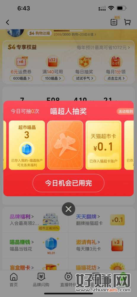天猫超市,我的,每日抽奖,抽了0.1猫卡