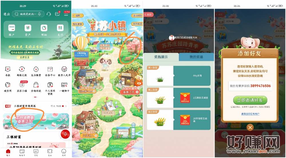 江苏工行苏苏庄园浇水20/120次,可得2/20立减金,浇一次水200克,输入好友邀请码各得500克