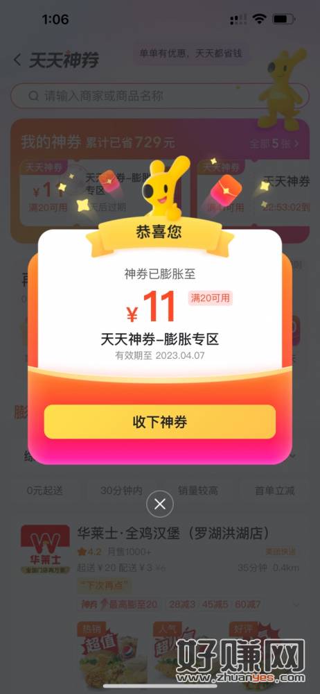 美团外卖app或小程序左上角切玉林,然后点天天神卷20-10
