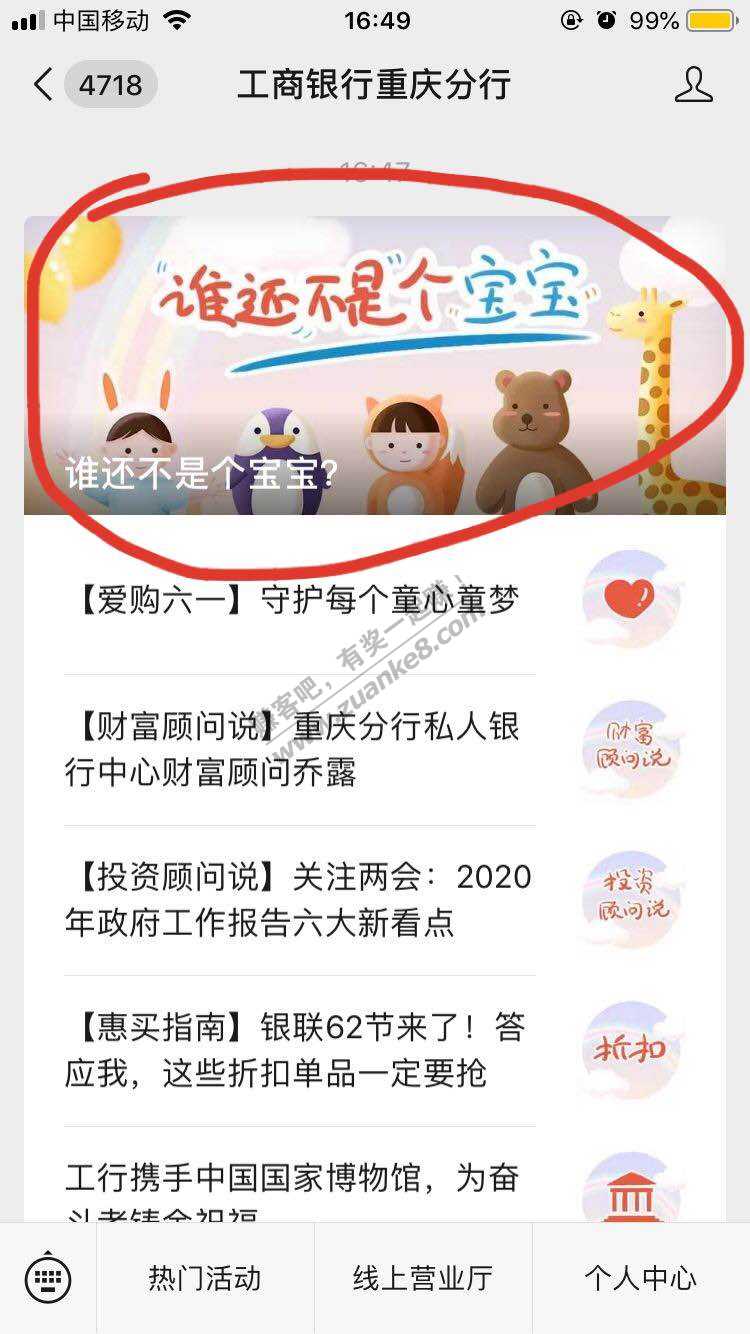 微信关注工商银行重庆分行,图中圆圈处阅读全文,亲测8.88。没水勿喷,刚中