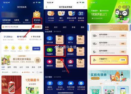【支付宝会员等级领2~5元猫超卡】新一期!支付宝APP->我的->支付宝会员->全部特权->天猫超市->黄金/铂金/钻石会员分别领取2/3/5元猫超卡