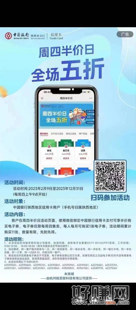 陕西中行 周四25买50立减金