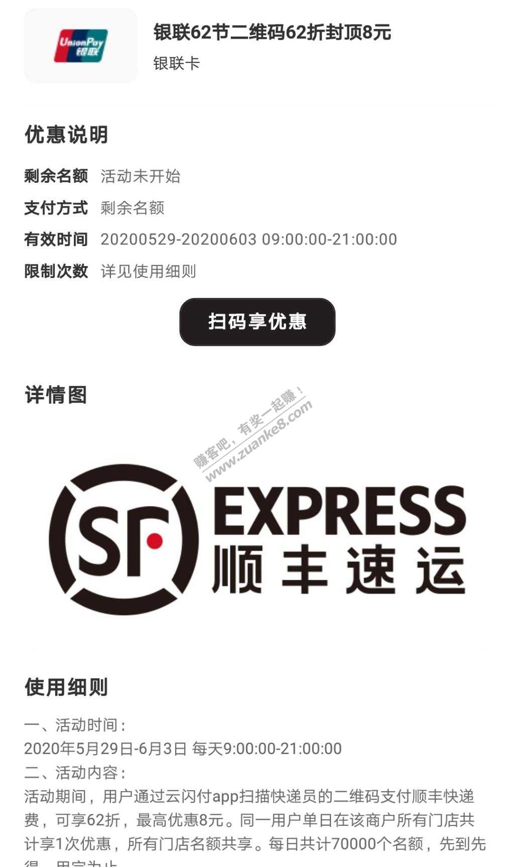 在云闪付里搜索顺丰即可出来,活动日期是5月29日至6月3日。