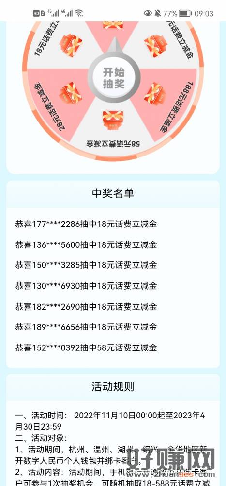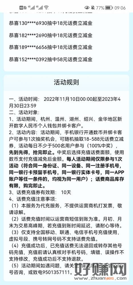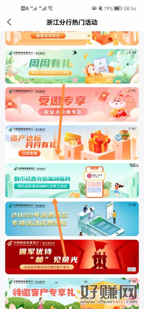 打开邮储银行,开通数字人民币可去邮储银行app首页活动专区抽话费券,自测刚中18话费券。开通数字人民币以后点击首页中的—活动专区,找到本地特色—浙江分行热门活动,进去以后往下滑找到—数币话费充值满减福利进去抽奖!!(在浙江地区的可以去试试)