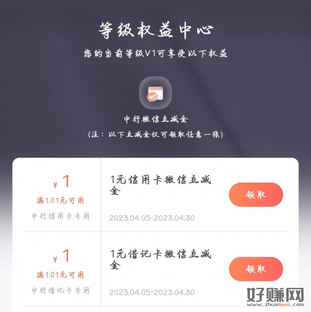 中行微信小程序→能量驿站→等级权益→领1元立减金(看好别领错