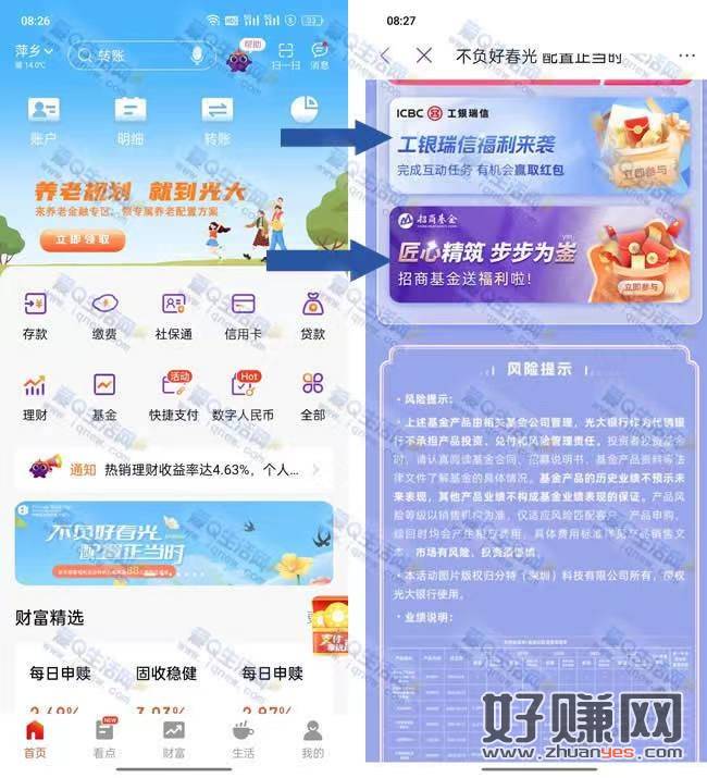 1.光大银行APP-首页中间滚动横幅【不负好春光 配置正当时】点进去下拉至【工银瑞信福利来袭】+【匠心精筑 步步为崟】点进去 完成所有任务抽
