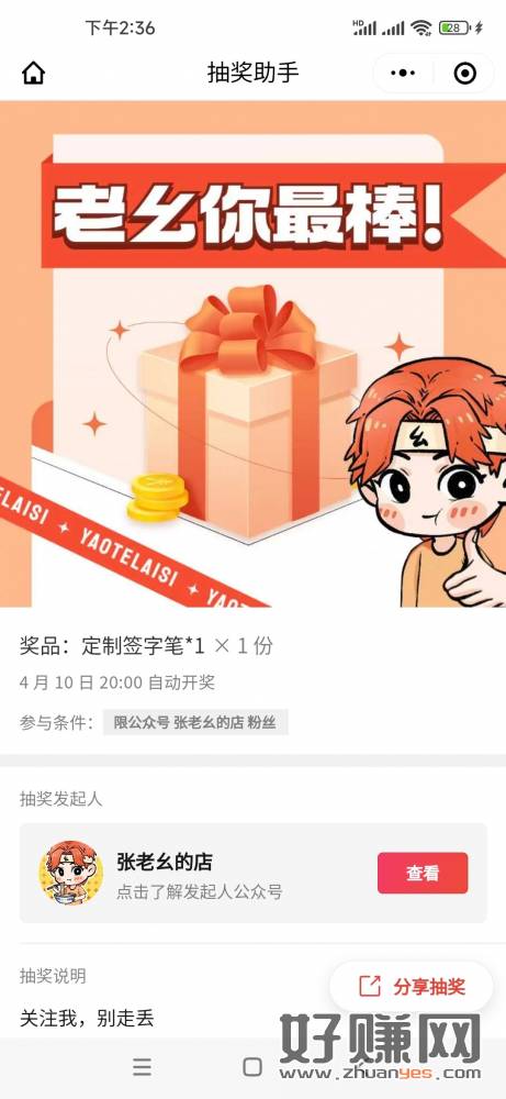 关注【张老幺的店】回复“老幺你最棒” 参与抽奖 奖品:签字笔 开奖时间:4月10日