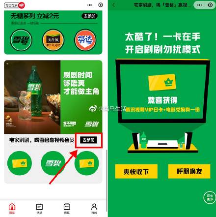 【可口可乐抽腾讯视频会员日卡】没中过的今天去试试!进入#小程序:可口可乐吧 ->下拉页面“宅家刷剧”进入->每天2次机会抽腾讯视频会员日卡