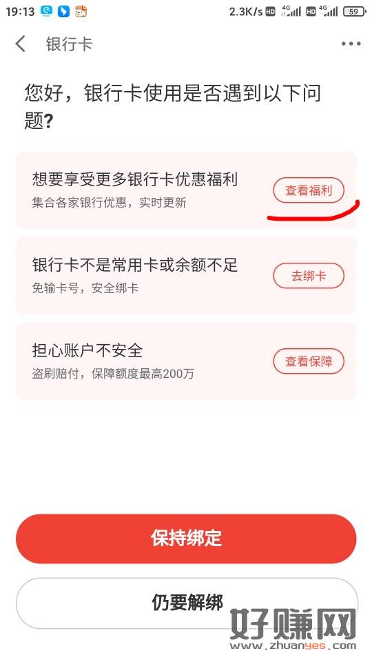 第一步,解绑银行卡时问题第一条,点击查看福利