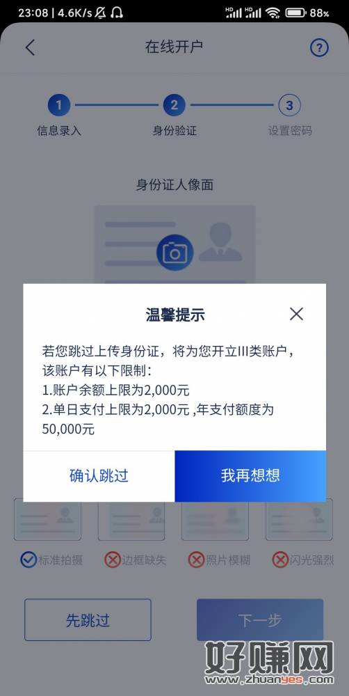 浦发银行16毛,没人发我就搬过来吧。开2类限制交通跟其他野鸡一类!所以开3类就好,注意拍照那里要跳过不然开不了3类!(5+2+1)*2=16