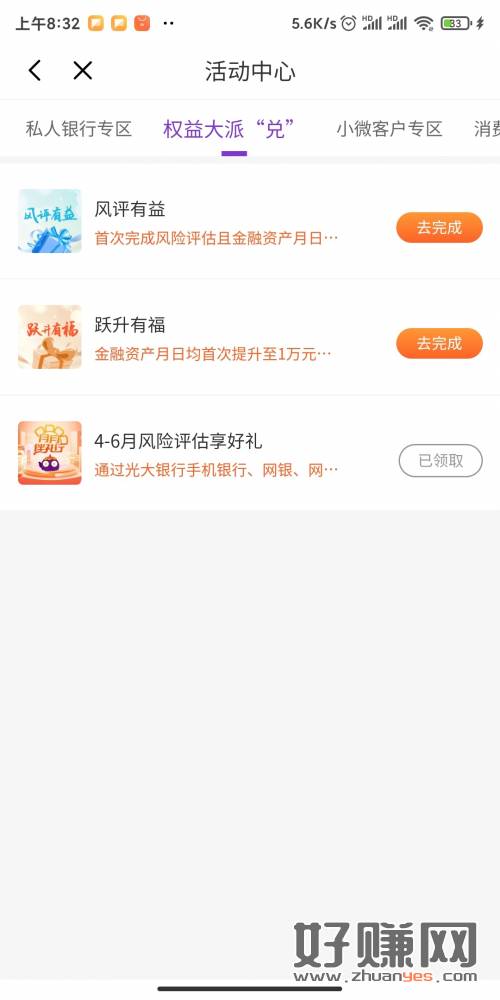 光大银行,我的权益里面。评估一次。必中8。随便填。要有任务才