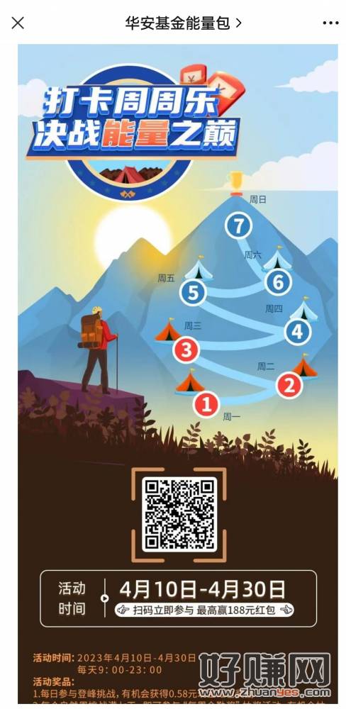 4.10-4.30每天打卡有机会的0.58,每周全勤奖,最高188,注册需要邀请人