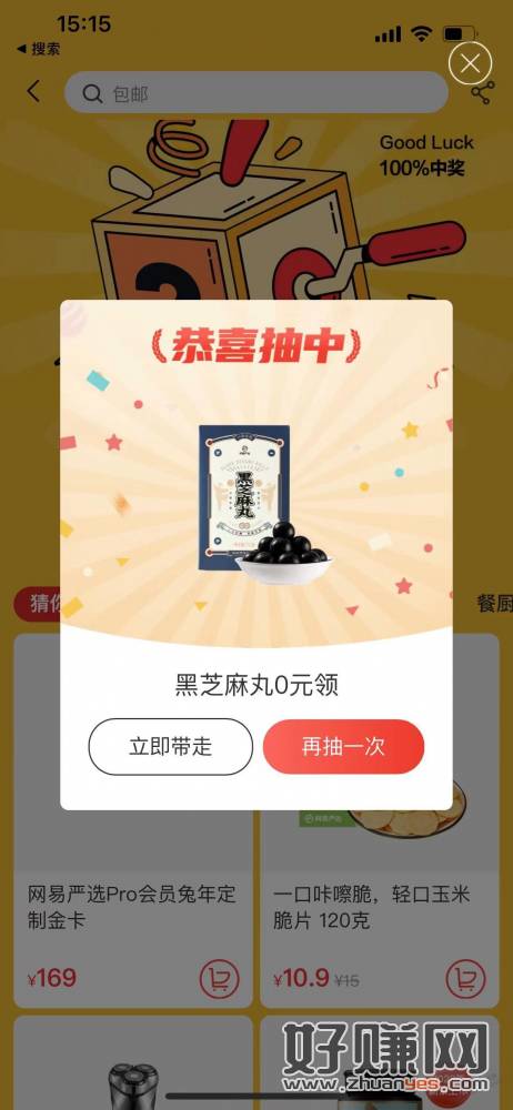 网易严选APP搜[吃货自由],刚用大号试了下99门槛,换小号实测0门槛,抽中了芝麻丸,0元包邮,速度冲,随时黄。