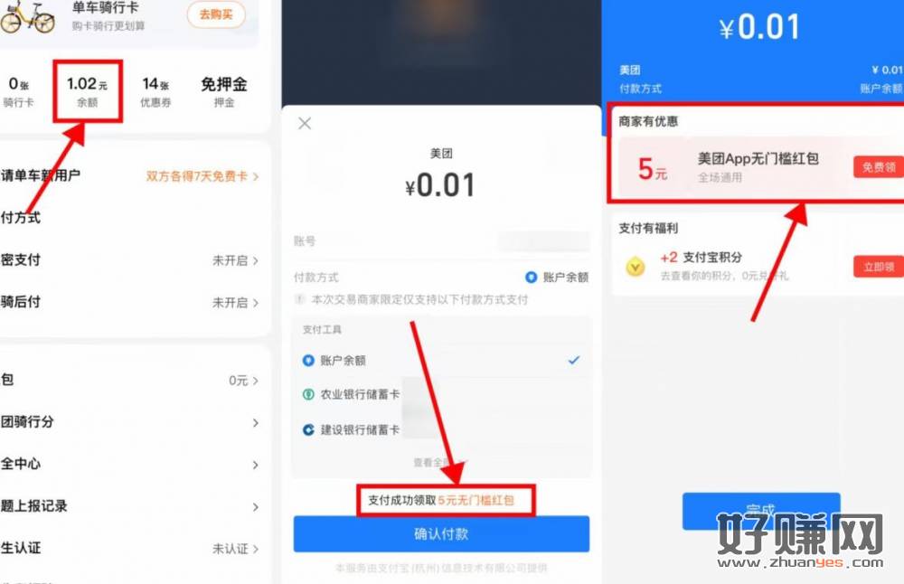 美团APP首页全部分类“骑车”,右上角个人中心“余额”,复制“0.01”数字粘贴(直接输入不行,必须粘贴)选择支付宝支付,如果支付时有提示“成功领取XX元无门槛券”就付,然后领2~5元美团通用券,在支付宝卡包中查看