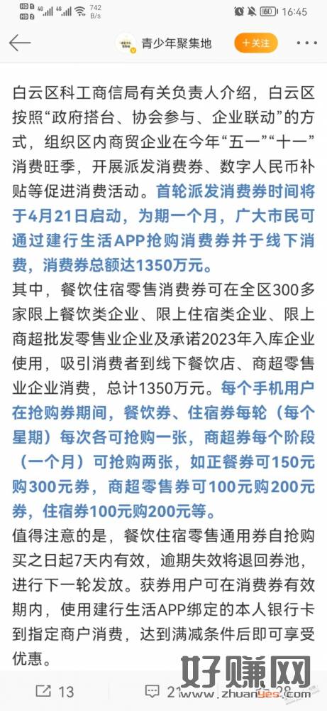 活动预告,4月21号,广东广州白云区,建行生活发消费券!!以前也发过这个券,应该是同个活动,商超和餐饮的券都特别香,相当于超市餐饮五折购!!