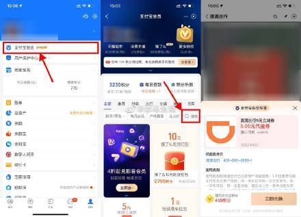 【支付宝积分兑换5元滴滴打车券】支付宝APP->我的->支付宝会员->搜索“滴滴出行”找到5元立减券,使用499积分兑换即可!