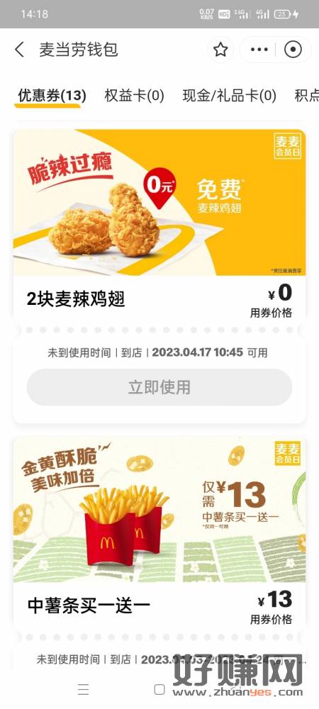 支付宝搜麦当劳,点进去看会员日,免费领取一对鸡翅。17号可用