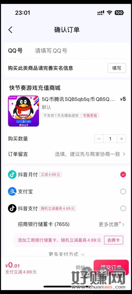 抖音商城 搜快节奏游戏充值商城 充5Q币 选抖音月付绑卡减4.99R 支付0.01