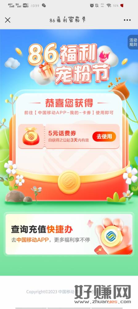 移动86福利宠粉节抽5元话费、流量日包等,亲测1元话费券