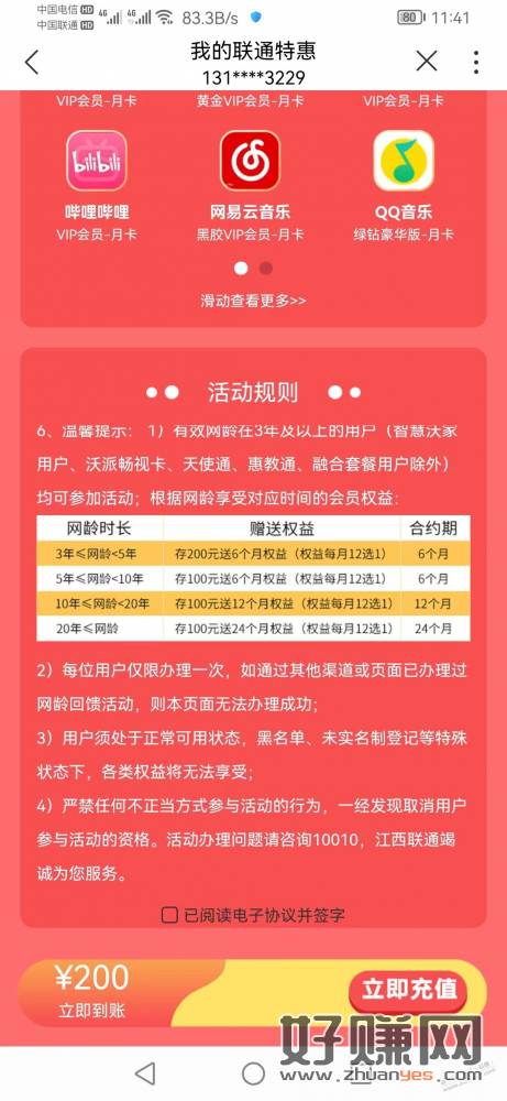入口:联通APP-老用户专区-滚动栏 网龄福利