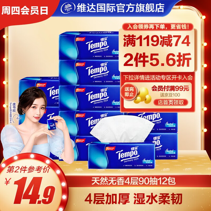 PLUS先领105-5全品,再领169-97券,得宝(TEMPO)经典天然无香抽纸90抽*12包