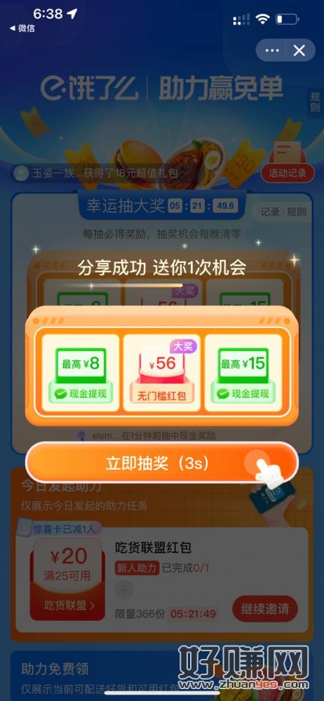 饿了么app-我的-助力免费领,假分一次抽
