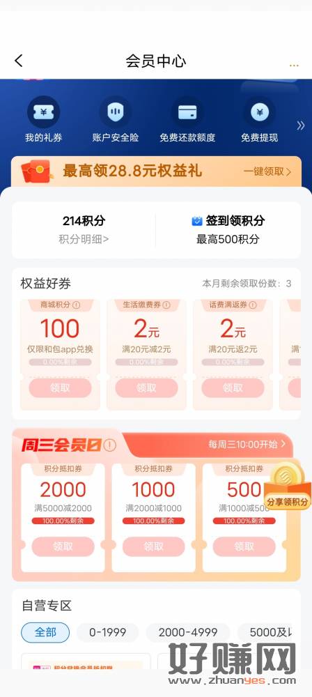 和包 500 积分 入口变了 会员中心 一键领取