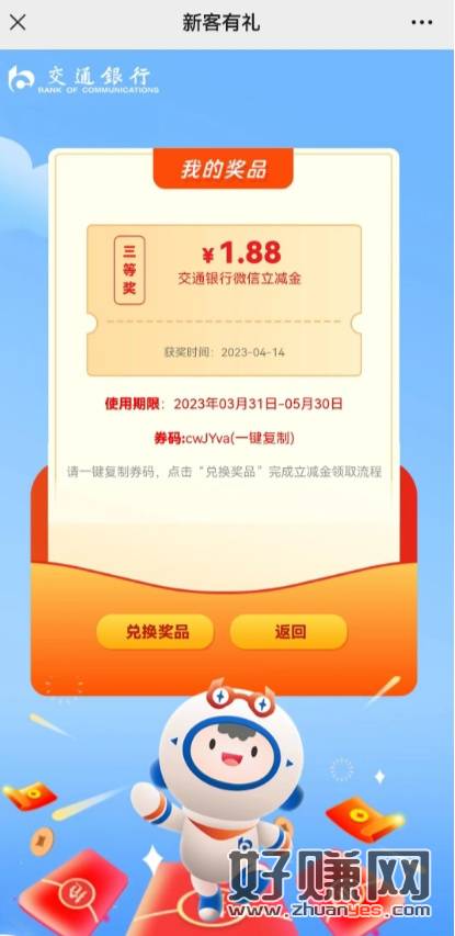 ❷交通银行湖南省分行首次关注抽奖,随机金额立减金(仅限湖南交行卡或者电子账户可用)