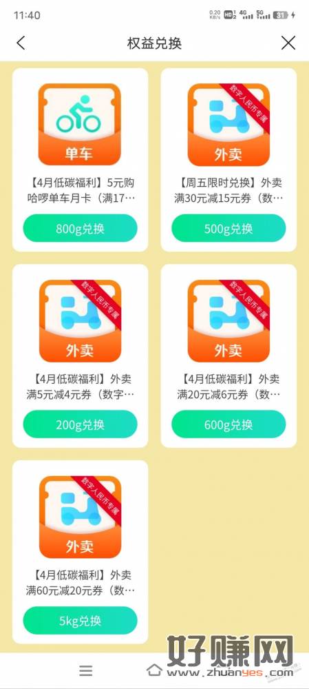 建行生活首页全部——低碳生活——权益——500g兑换数字人民币外卖券30-15